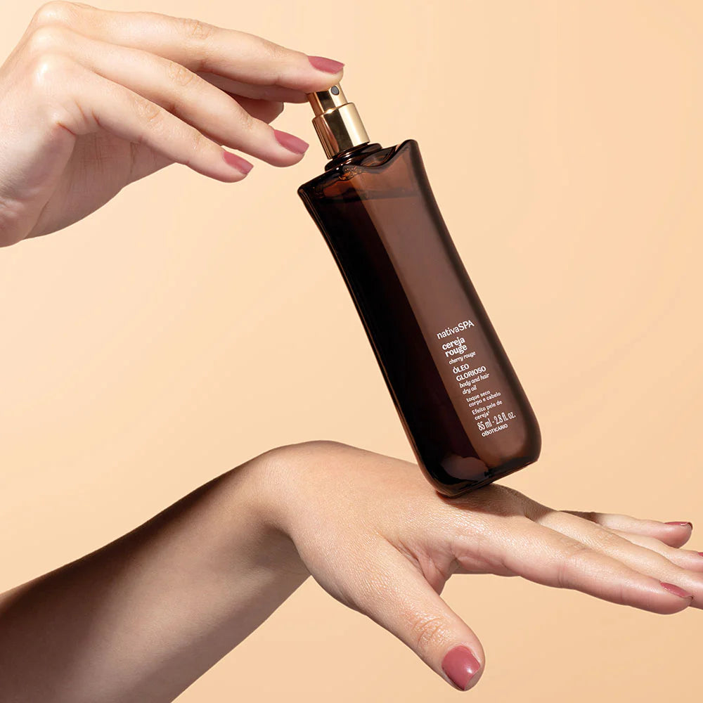 Pele acetinada, mais firme e irresistivelmente perfumada; cabelos radiantes, macios e protegidos – tudo graças ao poder nutritivo do Óleo Glorioso Cereja Rouge Nativa SPA.