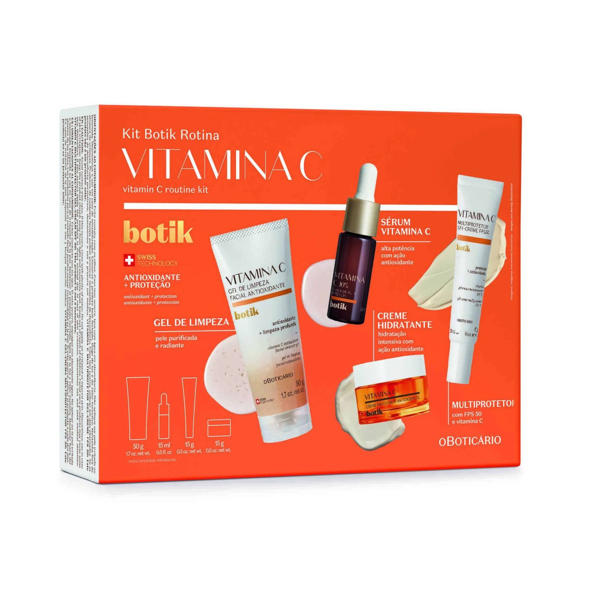 O Pack Botik Rotina Vitamina C da O Boticário é ideal para quem busca uma rotina de cuidados faciais eficaz e prática. Composto por quatro produtos em tamanho miniatura, este kit proporciona benefícios antioxidantes, hidratação profunda e proteção contra agressores externos.